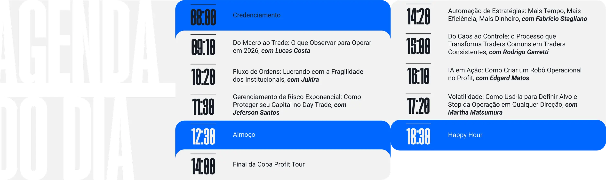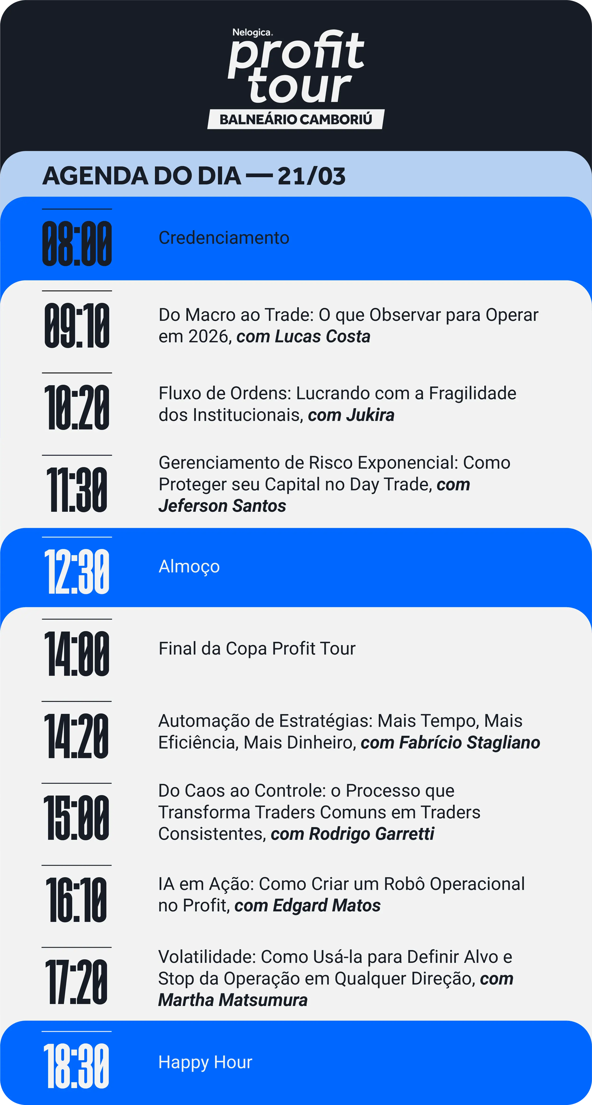 + 10 horas de conteúdo com grandes nomes do trading nacional, conteúdo prático e as novidades mais quentes do Profit, ao vivo, com quem vive disso todos os dias.