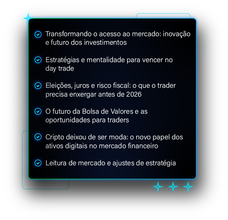 + de 20 horas de conteúdo com os maiores nomes do trading nacional, conteúdo prático e as novidades mais aguardadas do mercado financeiro — ao vivo, com quem vive disso todos os dias.