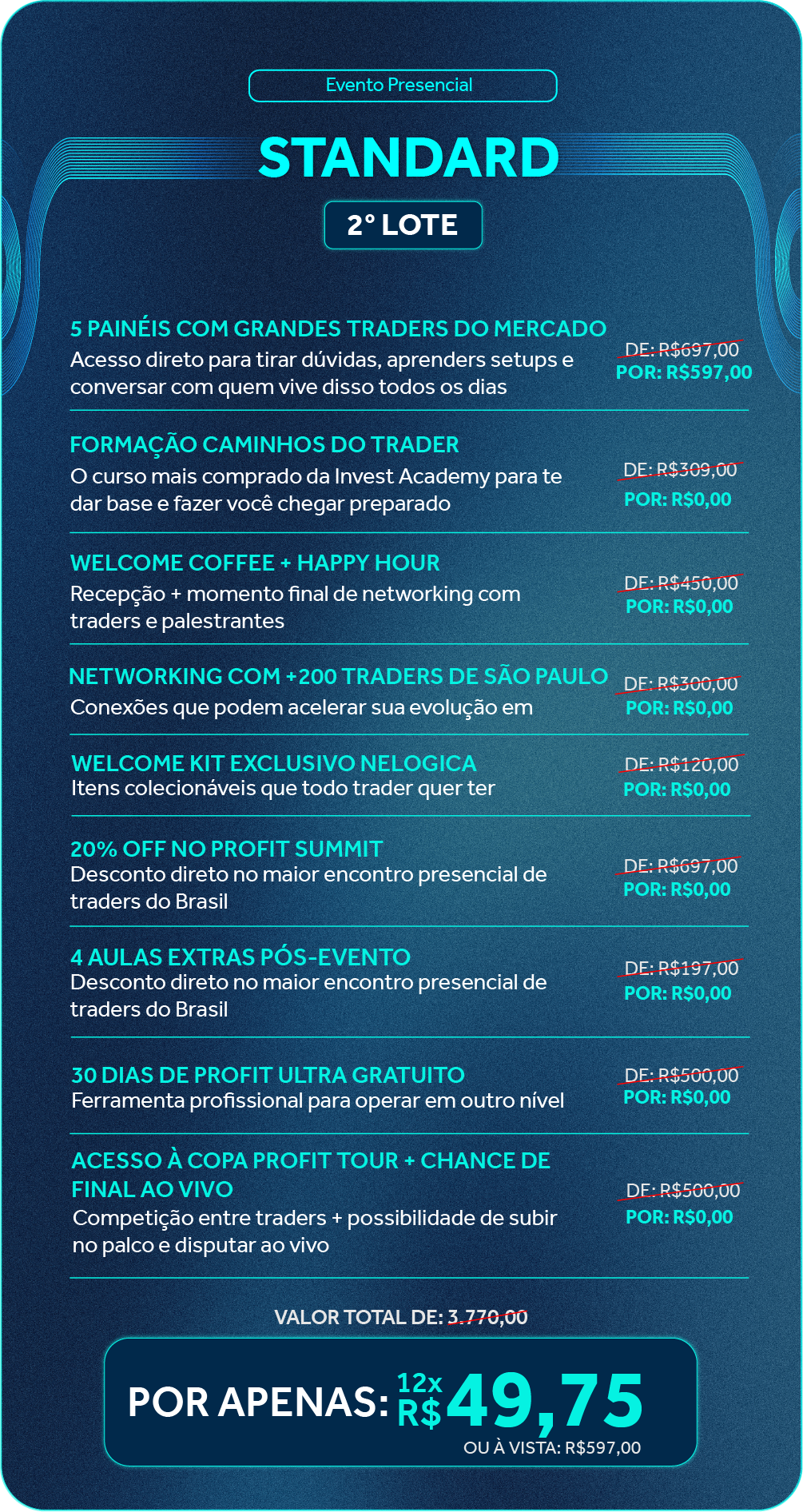 No Profit Tour®, você vai aprender ao vivo como alguns dos traders mais consistentes do Brasil analisam o mercado com precisão, gerenciam risco com estratégia e executam operações com confiança. Mesmo nos cenários mais voláteis.